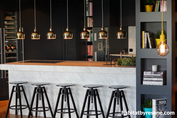 The stormy depths of Resene Foundry are softened by exposed brickwork and copper lights in this Australian apartment designed by Heidi Meyer of Yohm Interiors.