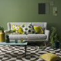 This unashamedly 1970s inspired living room has walls in Resene Paddock, joined by acid yellow and soft blue-grey accessories. The floor is specially stencilled in Resene Lignite and Resene Quarter Cararra, the coffee table top is in Resene Unwind, and the vases are Resene Intrepid and Resene Seaweed.