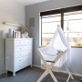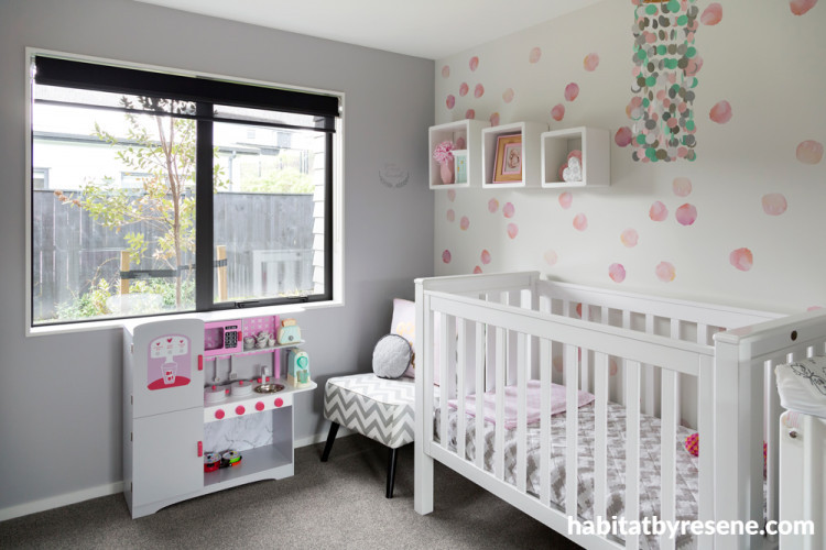 The nursery is painted in Resene Surrender and Resene Double Black White, in preparation for their baby girl due soon.