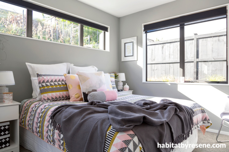 The guest bedroom is painted in Resene Delta, inspired by one of the team's bedrooms in last year's The Block NZ. Jenna likes that it's such a versatile colour.