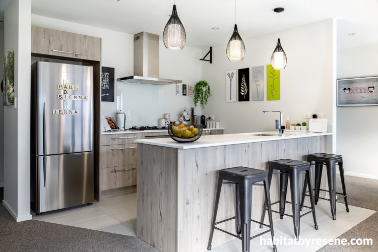 Painted in Resene Double Black White, the kitchen is a lovely, light space for the family to gather.