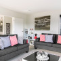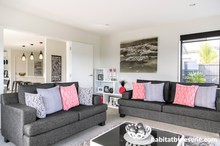 The lounge connects to the kitchen and living room, painted in Resene Double Black White.