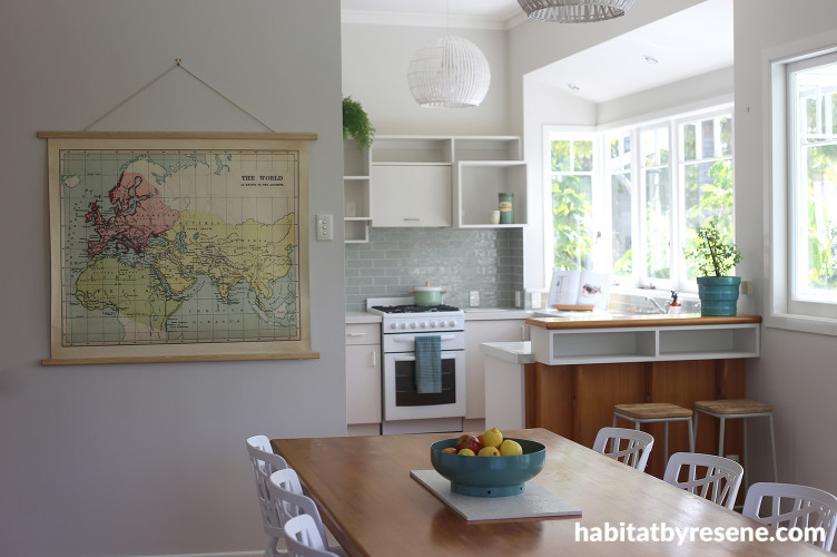 The kitchen is a favourite space in the house, painted in Resene Double White Pointer, cabinetry included. The trims are painted in Resene Half White Pointer.