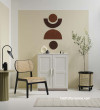 This relaxing space features walls in Resene Double Spanish White with borders in Resene Eighth Spanish White. The floor is in Resene Quarter Spanish White and the cabinet is in Resene Quarter Spanish White. The timber shapes are stained in Resene Colorwood Meranti and Resene Colorwood Dark Oak. The Art Deco table is in Resene Clay Creek, small vase in Resene Half Bokara Grey and larger vase in Resene Eighth Spanish White. Rattan chair and plant pot from Cane Collective, lamp from 10 Curated, rug from Briscoes. Project by Melle van Sambeek. Image by Bryce Carleton.