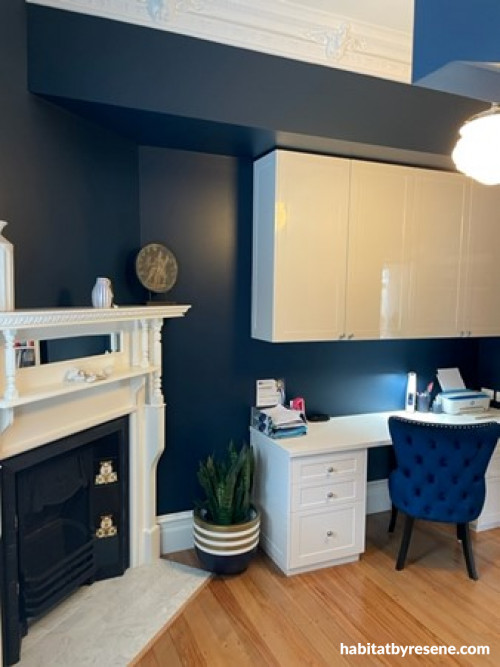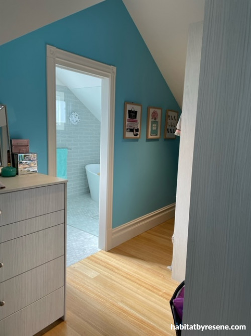 Nikki has added splashes of rich colour on just a few feature walls. In 12 year-old daughter Yve’s room it’s Resene Spray, a spirited aqua blue for a stand-out wall colour. In the study, she chose a deep navy – this was custom made by her Resene stockist to a colour swatch. It’s a room where colour helps distract the eye.