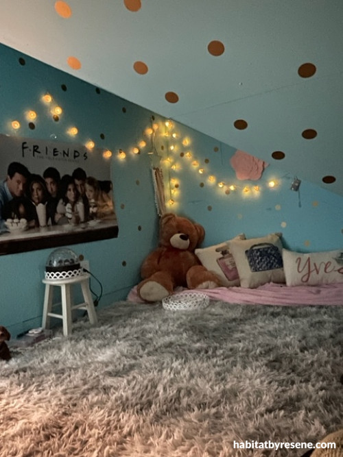 Another view of 12 year old Yve’s room where the walls are painted in Resene Spray. Fairy lights and spot colour circles add a fun element to the room which features Resene Quarter Alabaster on the ceiling and trims.