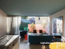 The downstairs bathroom features bold Resene Red Oxide on the ceiling, blending perfecting with the red toned tiles on the walls. The colourful garden wall is visible through the window paintedin Resene Red Oxide and Resene Fugitive.
