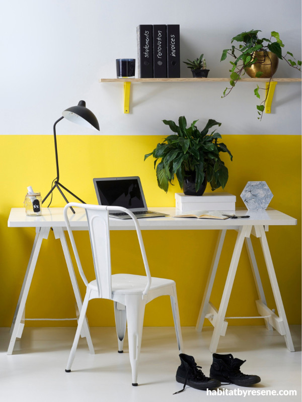 In this vibrant home office, the lower wall and shelving is painted in Resene Wild Thing, top wall, floor and desk in Resene White and folders and pot in Resene FX Blackboard Paint. Project by Amber Armitage, image by Melanie Jenkins.