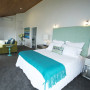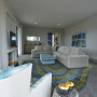 Walls in Resene Double White Pointer are a sophisticated neutral backdrop for furnishings in shades of blue and green, colours which echo the views of sea and bush outside.
