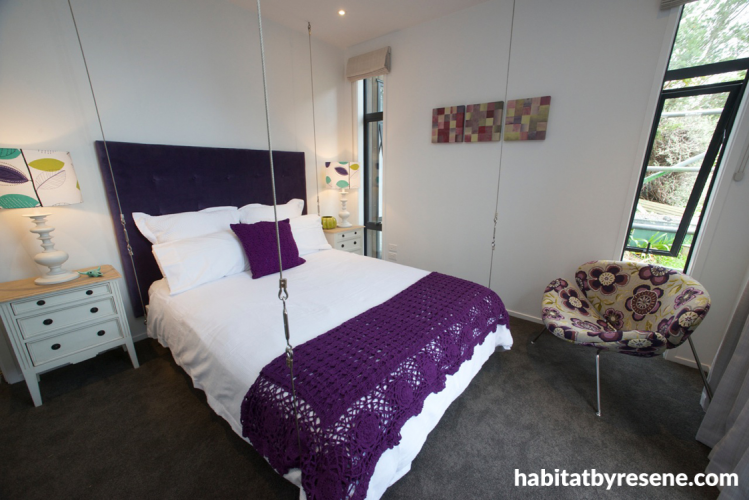 An inventive treatment for this bed saw it being suspended from the ceiling by cables. Shots of rich purple are offset by Resene Black White walls. In this video, Amanda explains the design and colour choices.