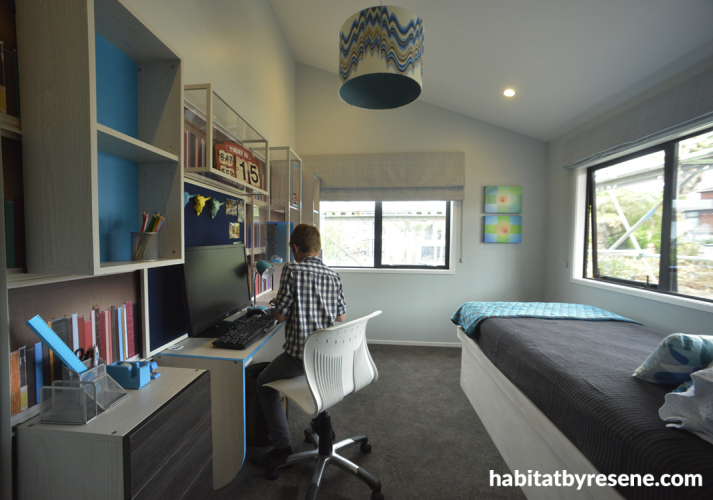 One of the boy’s bedrooms uses the cool blue of Resene Half Emerge on the walls and clever built-in furniture to make life easy. A video clip from the TV series shows us more.