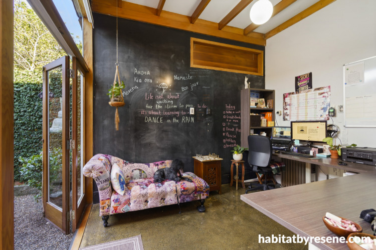 Resene FX Blackboard Paint provides a place to get creative in the home office. Resene Rice Cake is painted on the opposite wall and ceiling.