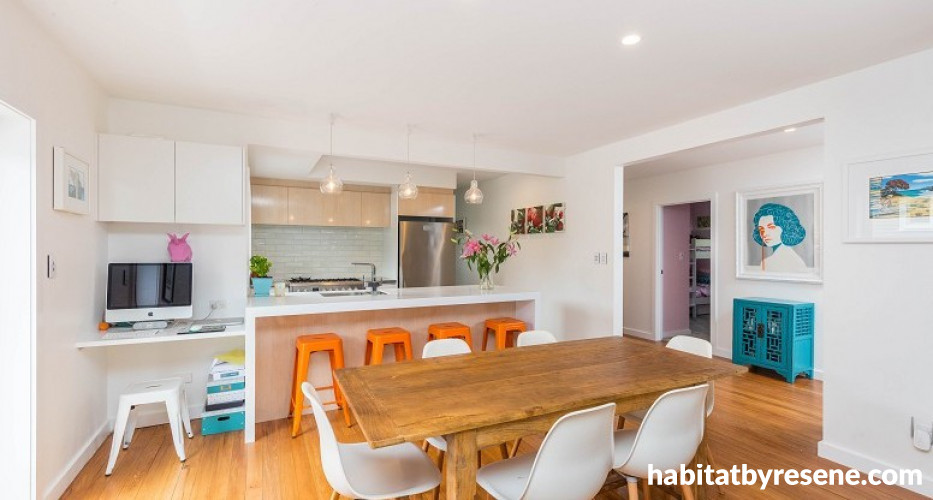 It expands to the dining and living room, painted in Resene Quarter Bianca.