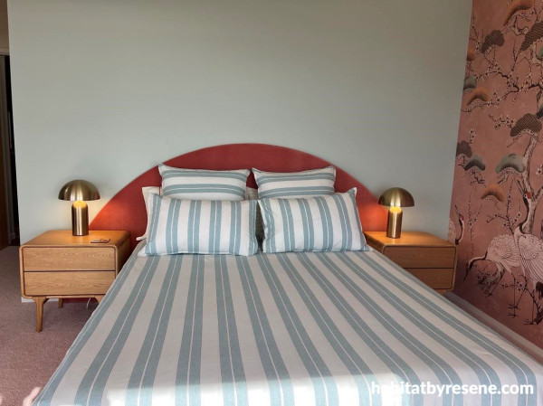 Naomi didn’t stop at calm and cosy though. A gentle dose of fun and femininity also found its way into the palette. “Resene Rainee as a feature wall colour was chosen in the master bedroom to complement Resene Wallpaper Collection 2311-174-04 from the Resene V & A Wallpaper Collection,” Naomi says.