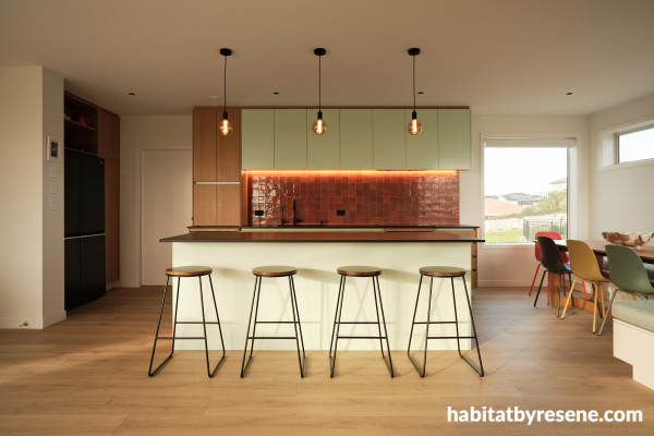 Noor says the kitchen is her favourite room in the house due to the combination of Resene Edgewater with the burst of contrast from an orange tile backsplash and natural plywood finishes.