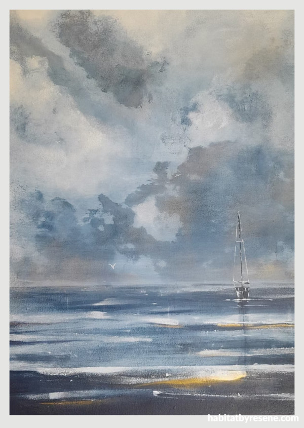 It’s easy to get lost in Greta Cole’s paintings. The wistful seascape scenes and contrast of colours with Resene’s blues, greens and odd touch of gold leave you captivated. Greta has always enjoyed painting and drawing right from an early age, and art naturally became her best subject while at school. Living in the Tasman District, there is an abundance of inspiration from the natural environment and stunning coastline. Check out more of Greta’s thoughtful seascapes here.