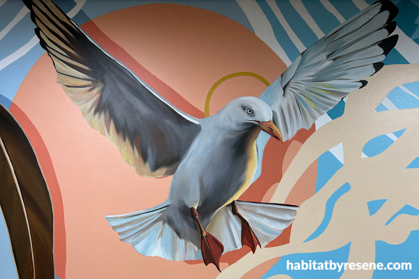 This seagull is part of Melanie’s 17-metre-long artwork which stretches across the corridor in Vicinity Bayside Centre in Frankston. It is painted in a mix of Resene Essential Cream, Resene Negroni, Resene Halcyon, Resene Refresh, Resene Tacao, Resene New York Pink, Resene Havoc, Resene Ruck N Maul and Resene Harvest Gold.