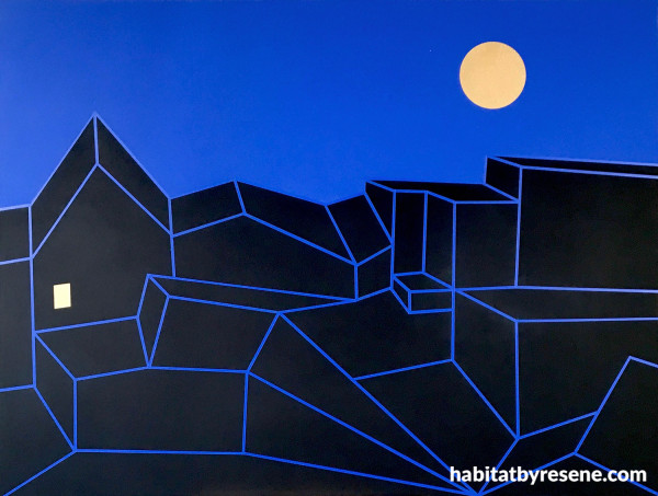 Greta’s painting, titled High Tide, offers feelings of tranquility and calm. This piece is painted in Resene Bunting, Resene Jaguar, Resene Half Sea Fog and Resene Indian Ink.