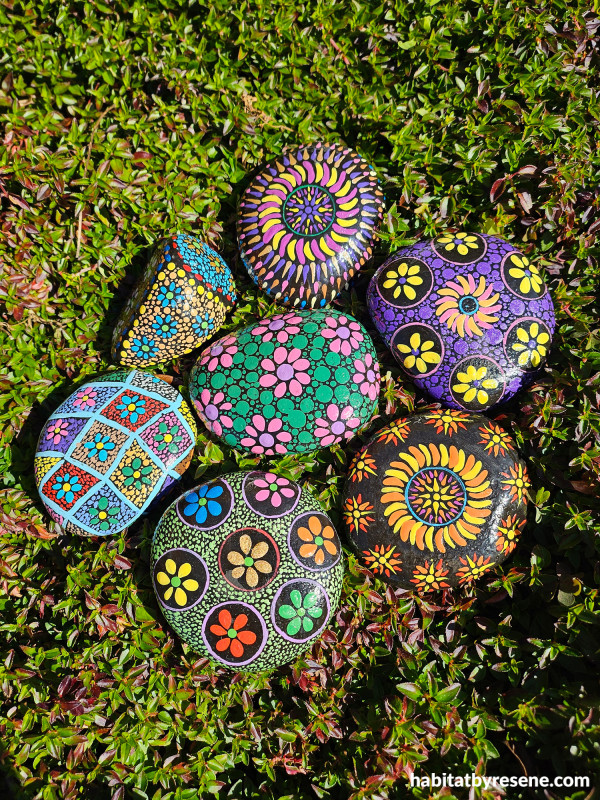 Baz’s rocks spread happiness with all of their bright and bold Resene colours painted in intricate patterns.