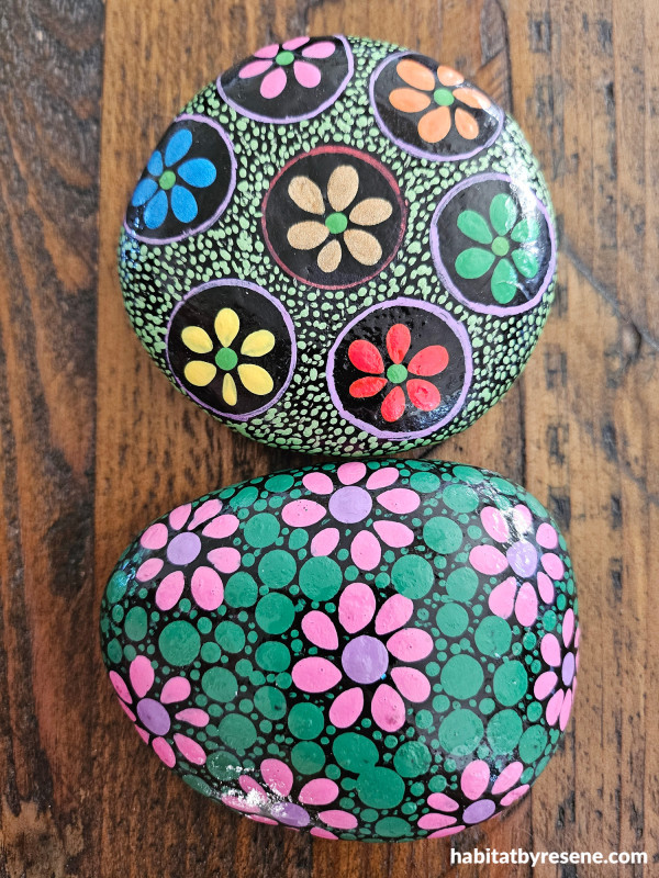 “I get my rocks from a local landscaper who is very generous with good deals and lets us choose our own rocks, mostly flat ones. I paint a Resene Black base which is the only brushwork I do. I am never sure how I will start or finish a rock, it just seems to happen. I consider myself the least artistic person I know which is quite surprising as they have become almost collectable to some people. I finish them off by covering them with a resin coating.”