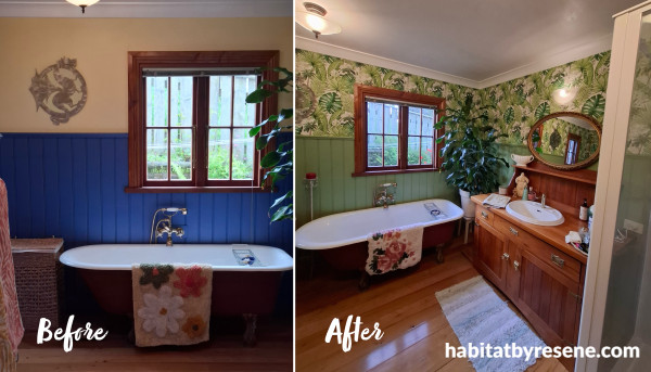 Homeowner Deborah recently transformed her bathroom into a nature-inspired retreat. Once cream and bold blue, it now features the fresh green of Resene Highland on panelling complemented by the tropical touch of Resene Eden Wallpaper Collection M37814. The rich timber flooring, vanity and trims add to the natural scheme creating the perfect spot to unwind.