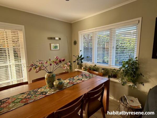 Tanja also painted her dining space in Resene Linen, a neutral with an earthy green edge, and the ceiling in Alabaster.