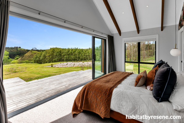 An incredible view to wake up to from the master bedroom, framed by walls in Resene Athens Grey and trims and ceiling in Resene Double Alabaster.