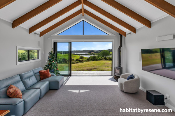 In the living room, expansive views of the lake and rolling hills are framed by the seamless canvas of Resene Athens Grey and Resene Double Alabaster. To get this look on timber beams, use Resene Colorwood Matai.