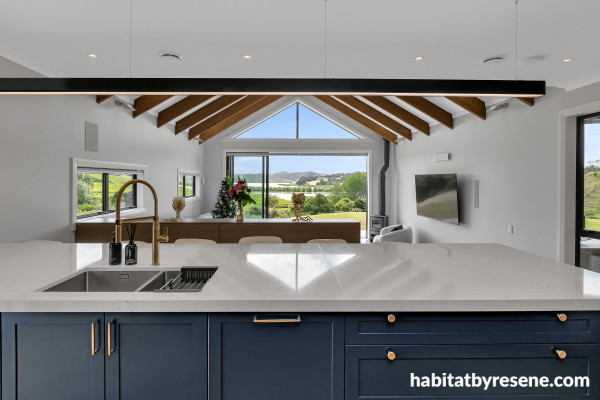 Even the kitchen has a front seat view to the surrounding landscape. The walls are painted in Resene Athens Grey with ceiling and trims in Resene Double Alabaster. For a bold blue in your kitchen like this, use Resene Coast.