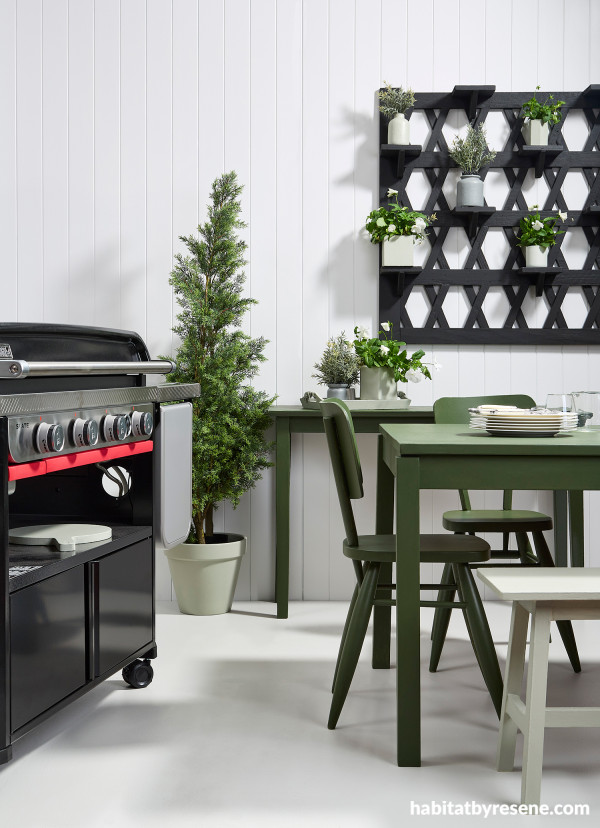 Wall in Resene Half House White, floor in Off Piste, table and chairs in Olive Green, trellis wall planter in Woodsman Crowshead, bench in Lemon Grass, pots in Koru and Double Rice Cake. BBQ from Weber. Project by Megan Harrison-Turner, image by Bryce Carleton.
