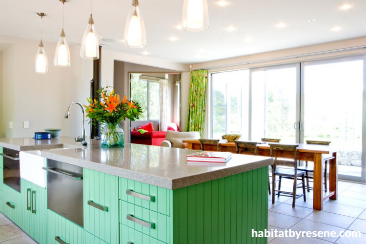 It’s a colour that goes hand-in-hand with the trend for botanic elements in interiors, whether that’s an overblown bright flower motif, or an elegantly stylised bamboo-motif wallpaper. The kitchen shown here uses the aptly named Resene Spirulina and was designed by Heather Thorley of Colour Options.