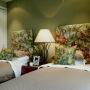 An evocative mix of bold floral fabric headboards and a dusky green wall in Resene Wilderness transforms this bedroom, designed by Rachael Buxton of Interioretc.