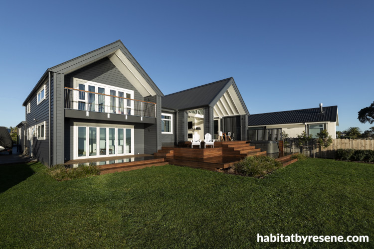 The exterior weatherboards are in pre-primed Vulcan cladding from Abodo, which arrived on site primed ready for painting in Resene paints. The exterior colour is the same as the original bach, Resene Sonyx 101 tinted to Resene Foundry in a Resene CoolColour variant to help reflect heat. The trims are in Resene Half Ecru White to coordinate with the joinery and the soffits are in Resene Double Alabaster. The deck is kwila which is best protected with Resene Kwila Timber Stain. Design by Lisa Day of Donnell Day Architects, image by Jessica Chloe Gernat.