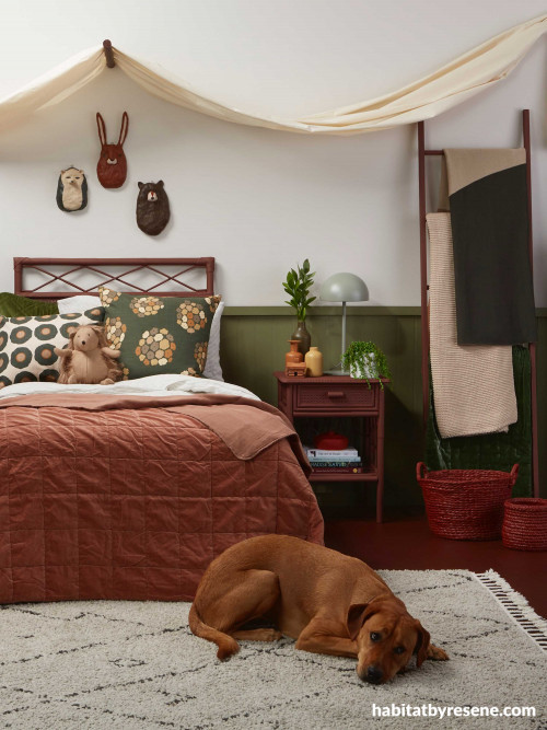 The wall of this woodland room is in Resene Eighth Joss and the tongue-and-groove panelling provides forest hues in Resene Finch. The rich floor colour adds warmth and is painted in Resene Digeridoo with the bedside table, canopy peg and ladder in a lighter Resene Redwood. The baskets provide colourful storage and are painted in Resene Farenheit. DIY animal masks are painted in Resene Hairy Heath, Resene Doeskin, Resene Sambuca, Resene Black Forest and Resene Nero. Cushions, duvet, lamp and throws from Citta, rug from Nood, calico cotton from Spotlight. All other items are stylist’s own. Project by Laura Lynn Johnston. Image by Bryce Carleton.