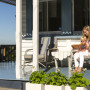 Nancy relaxes on the porch with Amelia. The weatherboards are Resene Black Haze, the baseboard is Resene New Denim Blue, and the deck and trims are Resene Tsunami.