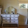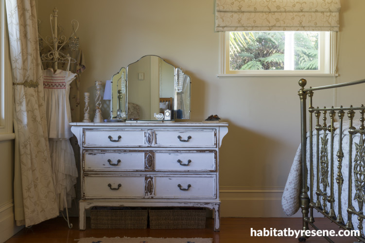 A whimsical collection of old furniture and ornaments dresses up a corner of the guest room, the walls of which are painted in Resene Gargoyle.