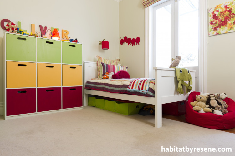 It wasn’t until Oliver (now four) and two-year-old Amelia came along that a love of bright colours came to the fore. In their room, a drawer unit glows with green Resene Sushi, orange Resene Carpe Diem and red Resene Pohutukawa. Even Oliver’s baby feet were used to create the art that hangs opposite his bed. Says Nancy: “I put him in his baby bouncer, dipped his feet in a colour and let him bounce to his heart’s content. When there was enough of one colour on the canvas I’d wipe his feet, dip them in the next one and away he’d go.”