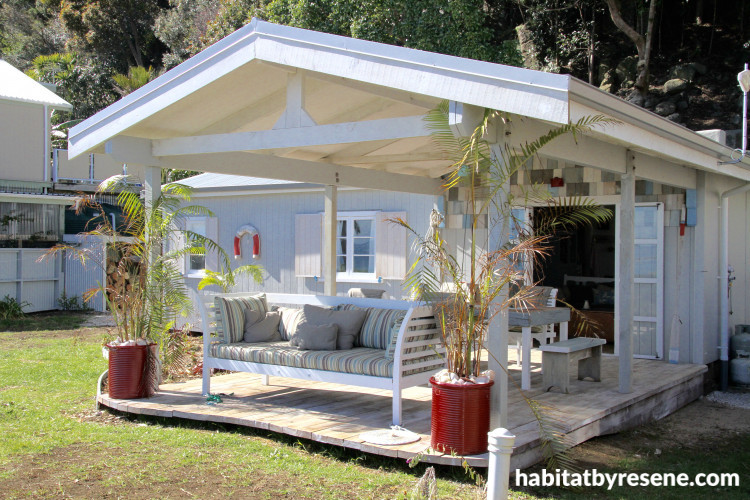 The exterior of Reef Cottage at Driftwood Seaside Escapes is painted in Resene Kensington Grey, with shutters painted in Resene Wan White.