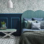 A mix of bold patterns and layers of throws and cushions, create a welcoming comfortable guest bedroom that could belong in any luxury hotel. The upper walls are Resene Wallpaper Collection 37520-2 and the lower wainscoting is Resene Tangaroa with battens and dado rail in Resene St Kilda. Stencilled floor painted in Resene Rice Cake with design in Resene FX Paint Effects medium mixed with Resene Tangaroa. Bench seat in Resene Stromboli with legs in Resene Duck Egg Blue, headboard in Resene Cashmere, pendant light in Resene Scoria and plant pot in Resene Duck Egg Blue. Project by Kate Alexander, image by Bryce Carleton.
