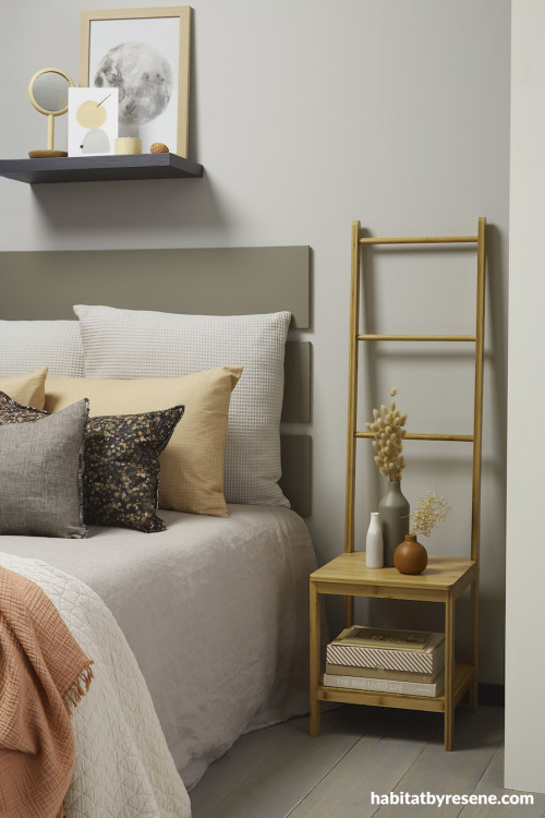 Guest luxury comes in all forms. In this bedroom beachy natural tones and textures bring comfort with a sense of peace and calm. Wall painted in Resene Eighth Stonehenge, floor in Resene Colorwood Mid Greywash, headboard slats in Resene Double Stonehenge, shelf in Resene Ebony Clay, small mirror and tealight holder on the shelf are Resene Corvette and vases next to the bed in Resene Double Stonehenge, Resene Half Barely There and Resene Rakaia (medium) and Resene Cinnamon. Project by Kate Alexander, image by Bryce Carleton.