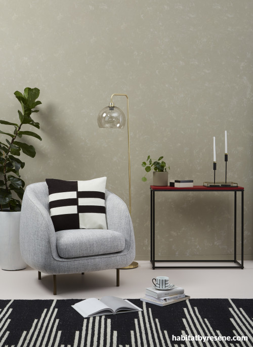 Adding a comfy chair to relax in is a beautiful addition to a guest room. The walls in this room are rag painted in Resene Napa with Resene Eighth Stonewashed on top. Floor painted in Resene Ethereal, console table top in Resene Dynamite and legs in Resene Noir, large planter in Resene Alabaster and small plant pot in Resene Pravda. Project by Laura Lynn Johnston, image by Bryce Carleton.