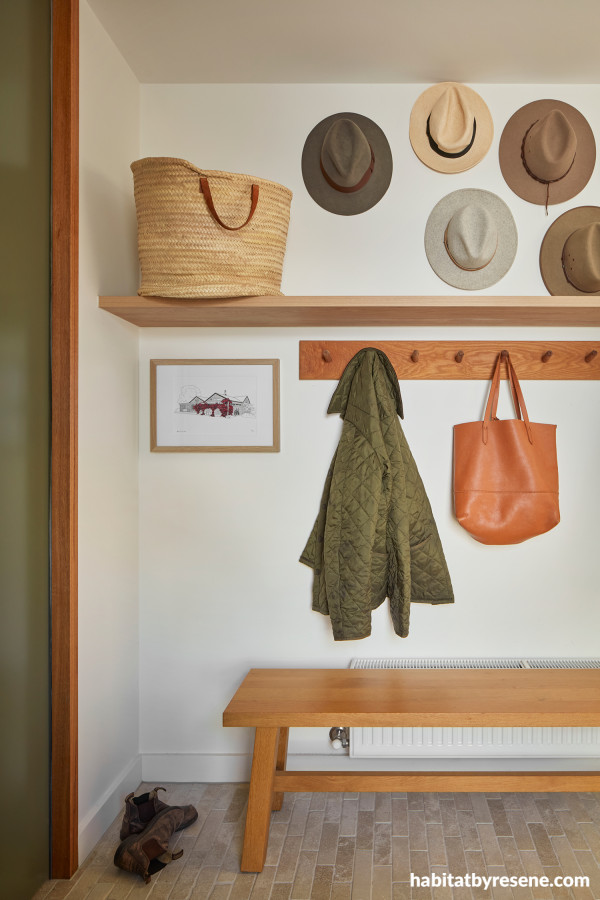 In the entryway, a cosy, country adorns the space, with warm wood tones mixing with Resene Double Lemon Grass and Resene Quarter Thorndon Cream.