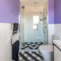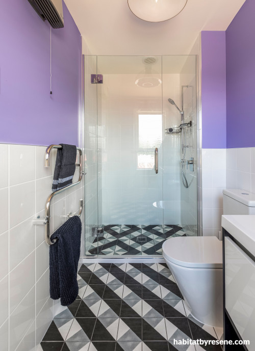 Resene Ce Soir adorns these ensuite walls, with the funky tile flooring playing off the bright purple. The ceiling is Resene Eighth Spanish White.