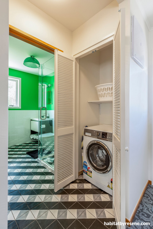 The main bathroom demands attention with Resene Wham, while the toilet (not shown) has a shot of colour with Resene Twisted Sister. “With names like Resene Wham, Resene Ce Soir, Resene Twisted Sister and Resene Grass Hopper, what is there not to love?”, laughs Mary.