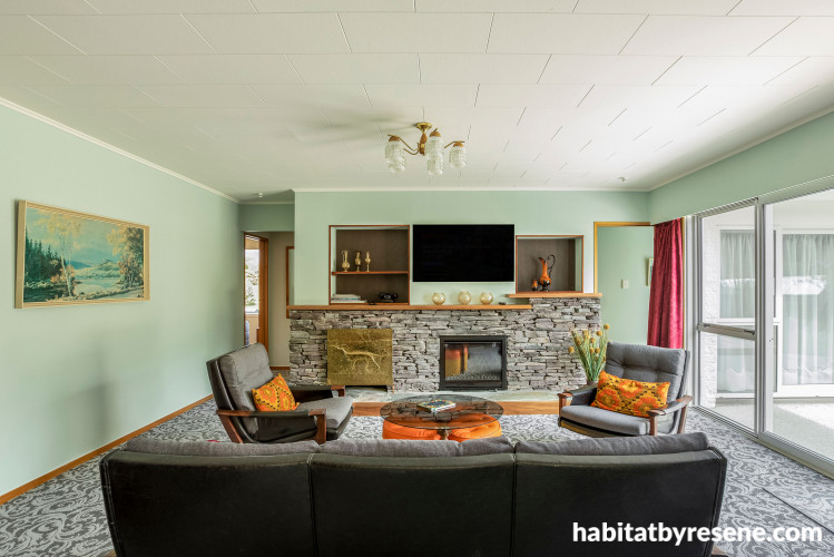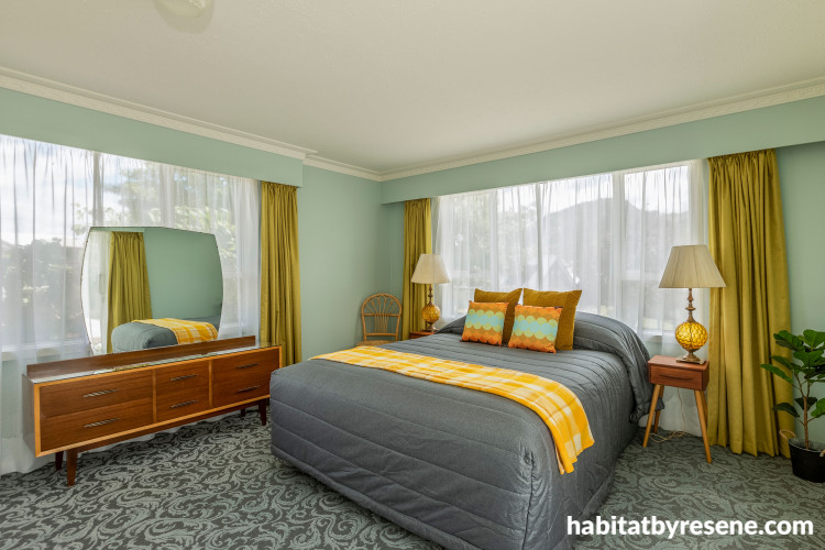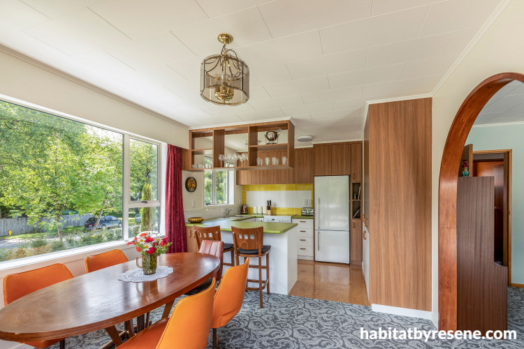 The exterior received a makeover of Resene Grasshopper and Resene Quarter Fossil, both in Resene Sonyx 101, a waterborne semi-gloss paint optimised for superior toughness, durability and adhesion, donning the traditional 1970s style where a well-coiffed family of seven should look right at home waving from the front steps.