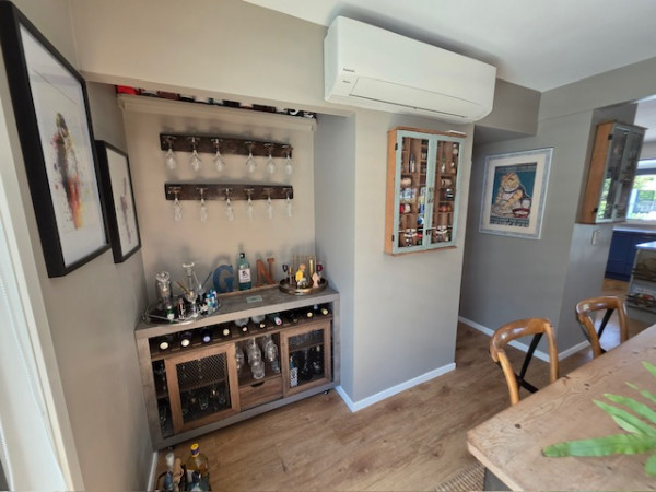 Bar and dining walls in Resene Half Pravda, trims in Black White.