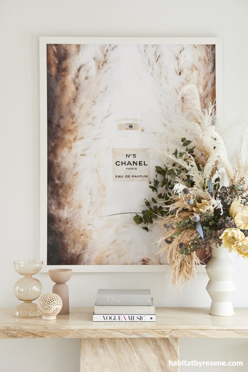 A vintage travertine console styled with a selection of chic objects and a piece of art above fills a blank wall in the entranceway and is also a handy spot to place keys. The wall is painted in Resene Alabaster.