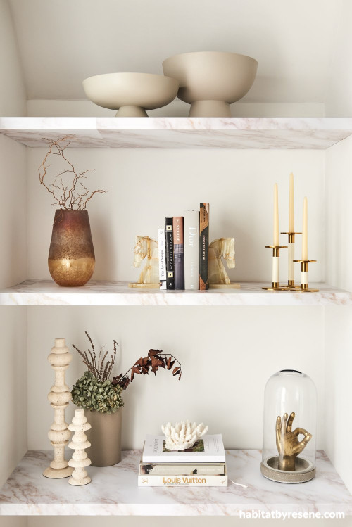 Whites and neutrals are a great choice if you’re displaying your chic and stylish décor that will catch the eye of anyone walking past. Resene Alabaster was the perfect neutral for this home’s walls, and the stunning marbled shelves give a touch of class and sophistication.