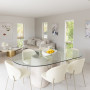 The minimalistic dining and living space are made bright and open by the white and neutral paint and decor. Resene Alabaster was painted on the walls and ceiling and Resene Double Alabaster on trims.