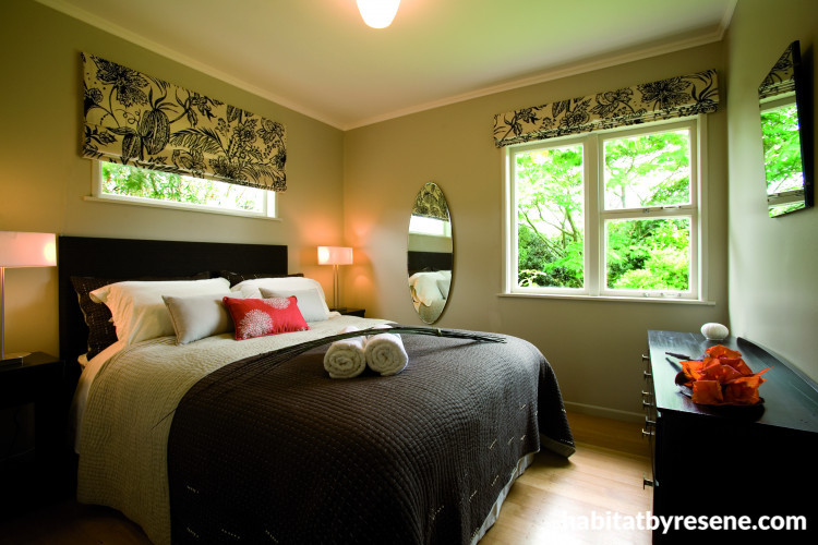 Simple botanic themed roman blinds are framed by Resene Half Tea walls.